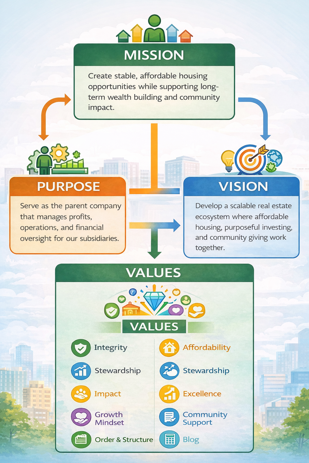 Our vision is to develop a scalable real estate ecosystem where affordable housing, purposeful investing, and community giving work together. We aim to expand rental opportunities for families, seniors, and veterans, while building generational wealth through real estate, education, and investment portfolios that create impact beyond profit.