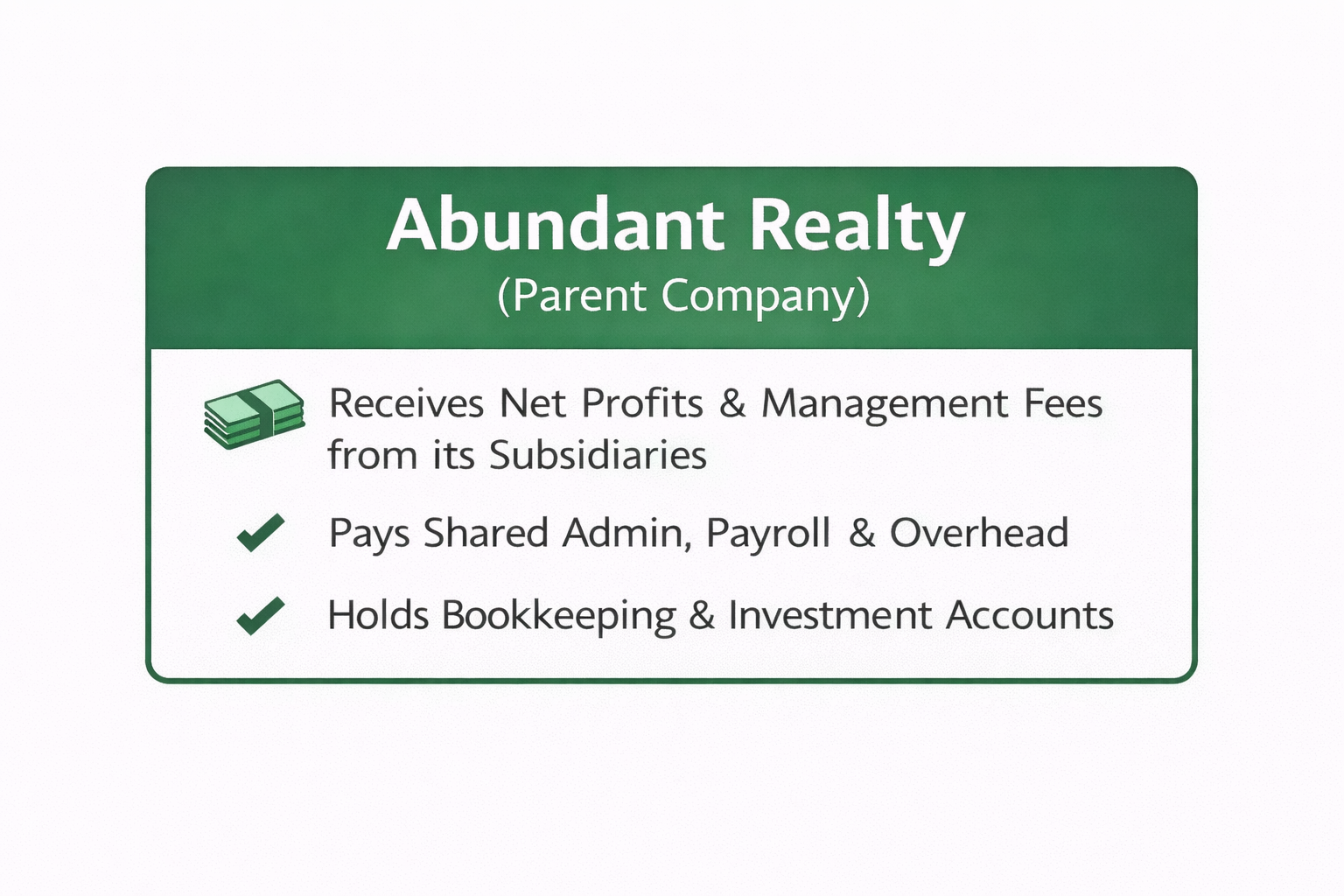 The purpose of Abundant Realty is to serve as the parent company that manages profits, operations, and financial oversight for our subsidiaries. We exist to create order, structure, and sustainability across the entire business ecosystem so that rental income, fix-and-flip profits, investments, and community giving remain aligned with our long-term mission.