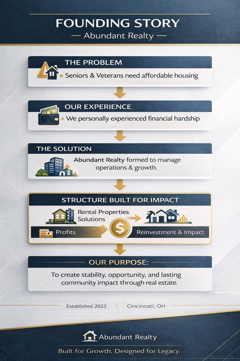Abundant Realty was founded with a simple belief — safe, stable, affordable housing should be accessible, especially for seniors and veterans. Our founders understood financial struggle firsthand, and recognized the need for housing options that were not only cost-conscious, but operated with dignity and respect.